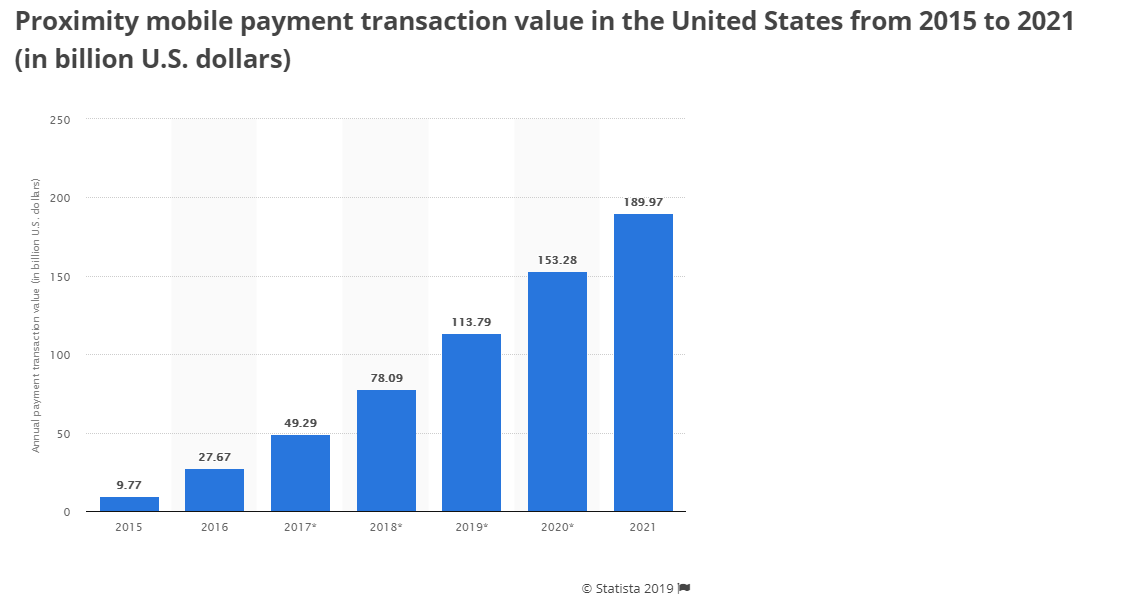 This Statista chart shows the approximate value of all mobile payment transactions in the U.S. In 2018, mobile transactions were valued at $78 billion (up 59% from 2017) and are projected to reach $113 billion in 2019.