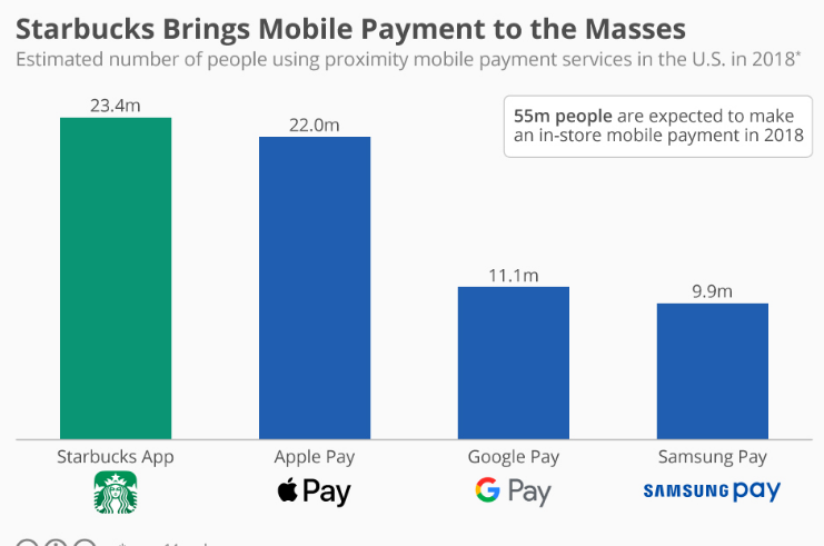The chart below shows that digital wallets Apple Pay, Google Pay and Samsung Pay, are all popular with a combined total of 40 million users. Yet individually, they each have fewer users than the Starbucks app.