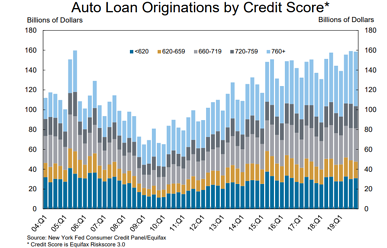 Auto debt is the 3rd largest debt category in the US after mortgages and student loans. It now makes up 10% of total household debt. The Federal Reserve Bank of New York issues a quarterly household debt study and based on its most recent study, and as seen in the chart below, about 15% ($25 – 30 billion) of 2019:Q4 auto loans are considered subprime.
